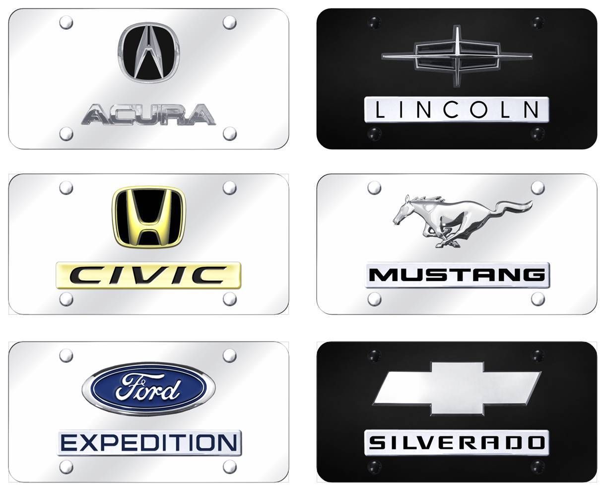 Can't decide whether you'd like a logo license plate or a name badge license plate? Why not have both with our dual name and logo license plates (novelty logo tags)! This unique and beautiful license plate comes in the standard full- size (6" x 12") license plate and contains both the vehicle make logo and the model factory font name. We have them available for most vehicles and some are even available with gold names and logos (exceptions noted below).